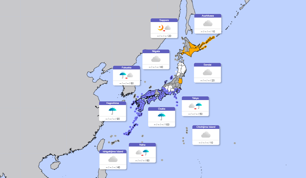 – En las regiones de Nishinihon, Tokai y Kanto nublado y lluvia en algunos puntos durante la mañana. Sol a partir de la tarde.