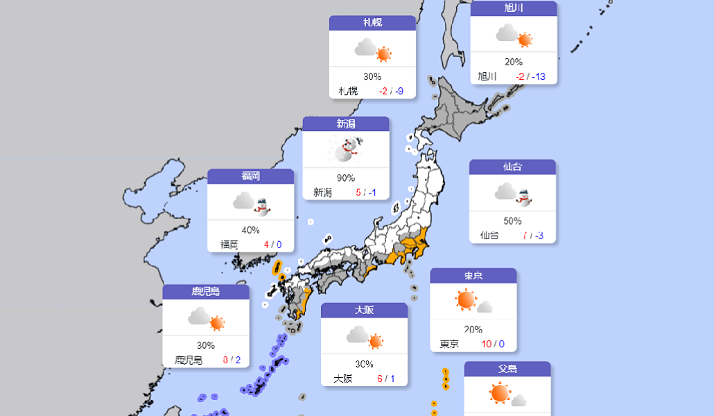 En la región de Hokuriku es necesario estar alerta por ráfagas de vientos fuertes con rayos y hasta tornados. La agencia señaló que debe ponerse atención a las montañas de la prefectura de Gifu donde puede caer la nevada más intensa de este invierno.