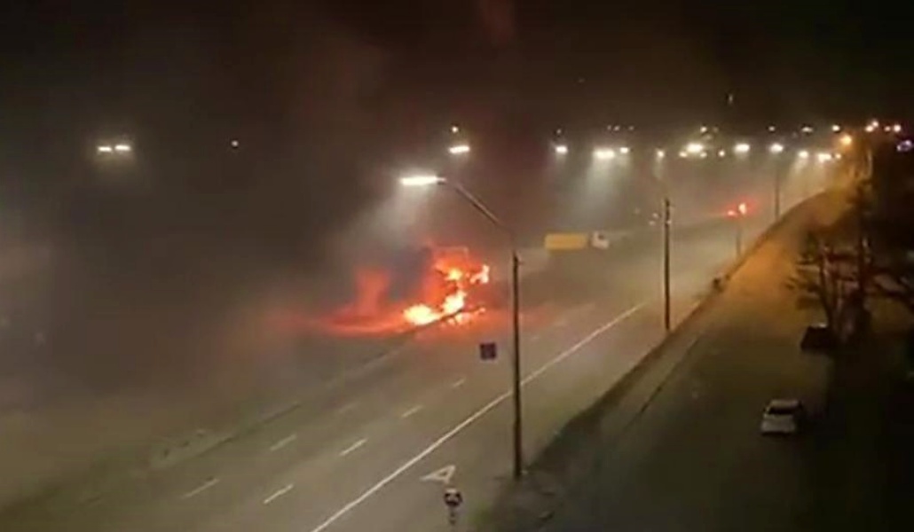 Una imagen divulgada en una red social mostró a al menos dos unidades blindadas rusas ardiendo en fuego tras ser interceptadas por la defensa militar cerca al metro de Beresteiska.