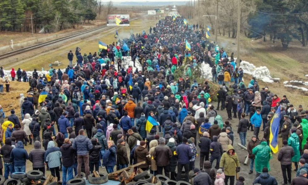 Resistencia en Energodar, donde está la planta nuclear bombardeada.Este bombardeo ocurrió horas después de que miles de residentes de Energodar realizaran una concentración de resistencia pacífica en la carretera de acceso a la ciudad para impedir el paso de un convoy ruso. Unidades de transporte y vehículos blindados fueron obligados a regresar a sus líneas, aunque por la noche volvieron y abrieron fuego contra los puestos de control ucranianos.