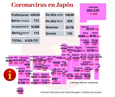 Japón registró hoy viernes 6 de mayo 21.628 nuevos casos de coronavirus y 37 muertos, según los datos del Ministerio de Salud, Trabajo y Bienestar Social.
