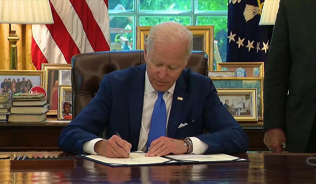 “El costo de luchar no es bajo, pero el costo de rendirse sería mucho más alto, y es por eso que nos mantenemos firmes”, dijo Biden. Señaló que firma el acto justo después del Día de la Victoria en Europa y el Día de Europa.