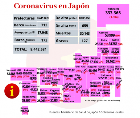 Japón registró hoy martes 17 de mayo 36.903 nuevos casos de coronavirus y 39 muertos, según los datos del Ministerio de Salud, Trabajo y Bienestar Social.