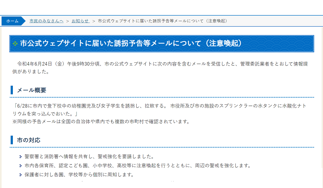 Varios municipios de la prefectura de Ibaraki se han apresurado a adoptar acciones de seguridad luego que la noche del viernes empezaron a recibir un correo electrónico amenazando con el secuestro de niños del kindergarten y escolares y el envenenamiento con soda cáustica de los tanques de agua que alimentan los aspersores de la ciudad.