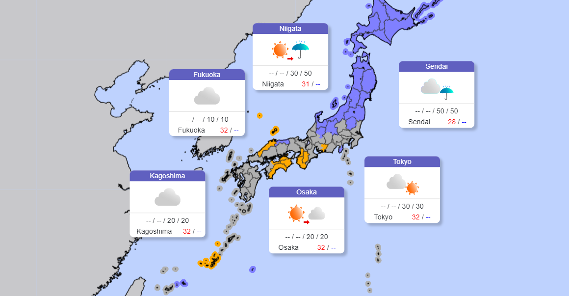 En el este y norte de Japón hay riesgo de fuertes lluvias y relámpagos como efecto de una masa de baja presión con aire cálido y húmedo y aire frío a unos 6.000 metros de altura.