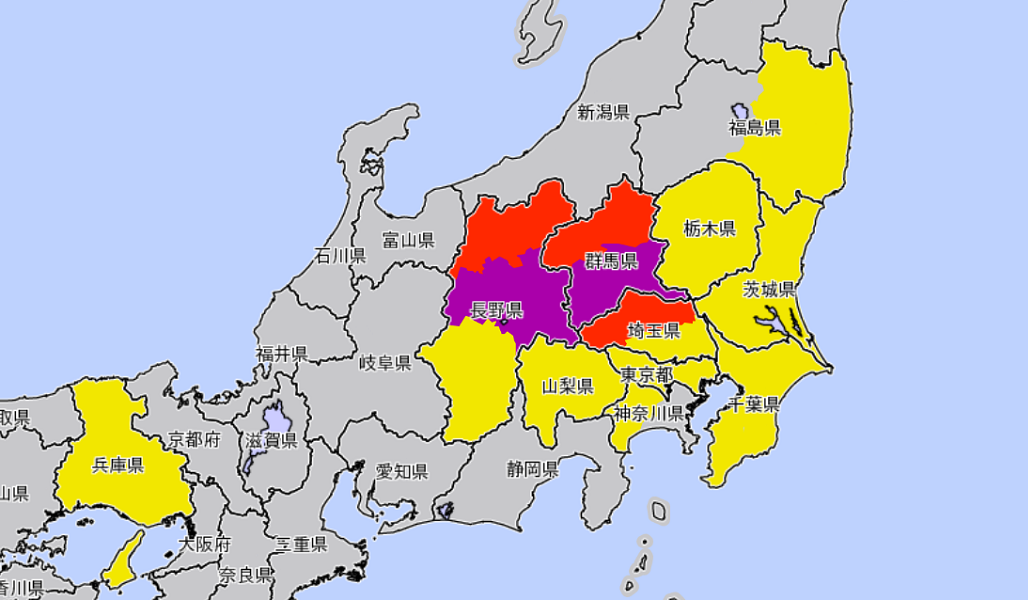 La Agencia Meteorológica de Japón emitió esta noche una «advertencia por grandes lluvias en corto tiempo» (Kirokuteki tanjikan o-ame joho) de 120 mm en una hora en los alrededores de la localidad de Yoshii-machi en la ciudad de Takasaki, prefectura de Gunma.