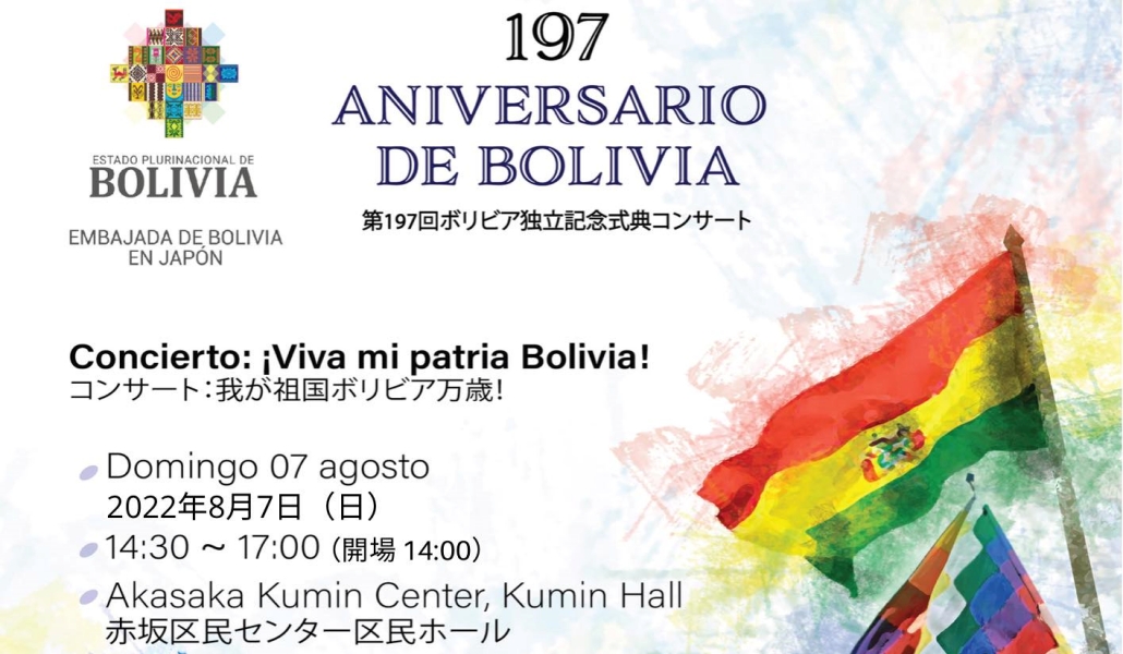 La Embajada de Bolivia en Japón anunció la realización del concierto «Viva mi Patria Bolivia» para celebrar el día nacional el próximo 7 de agosto en el Kumin Hall del Akasaka Kumin Center en Tokio.