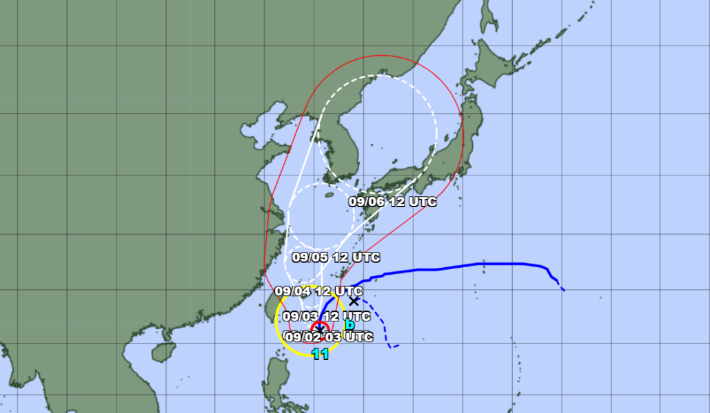 Desde de las 15.00 horas de este jueves 1 de septiembre, el «violento» tifón No. 11 se desplazaba en dirección sur-suroeste, a unos 330 kilómetros al sur de la isla de Miyako, a una velocidad de unos 15 kilómetros por hora. Se supo que el tifón Nº11 absorbió al tifón Nº12 y se hizo más potente y peligroso.