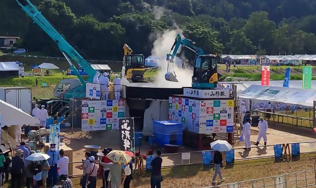Después de dos años de restricciones por el coronavirus, el lecho del rio Mamigasaki, en la ciudad de Yamagata, volvió a ser escenario del «Festival de Imoni Nº1 de Japón», el famoso evento que desde hace 34 años prepara esta tradicional sopa de la prefectura en una gran olla de 6,5 metros de diámetro y utiliza dos mini retro excavadoras como utensilio de cocina.