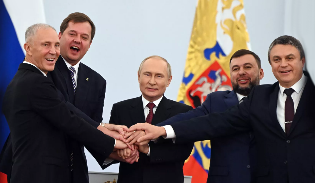 Los cinco firmaron » acuerdos para unirse a Rusia». La ceremonia repitió la anexión de Crimea en 2014, cuando tres colaboradores de la península se reunieron en la misma mesa del Kremlin.