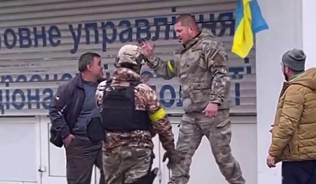 Un vídeo muestra cómo un hombre vestido de civil bromea y luego se abraza con un militar que puso una bandera ucraniana en la puerta del edificio de la Jefatura Regional de Policía.
