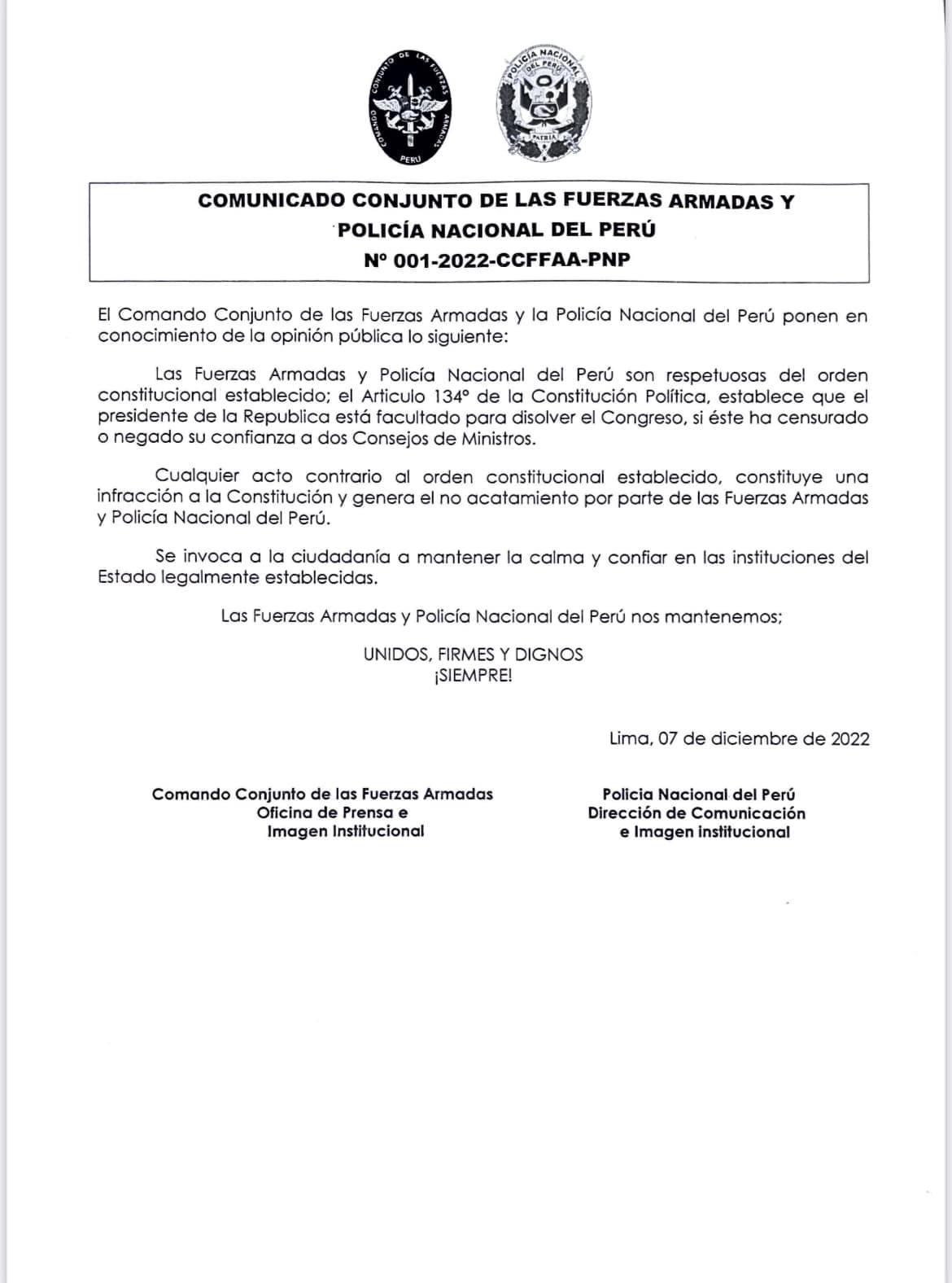 Un comunicado conjunto de las fuerzas de seguridad peruanas dijo que «cualquier acto contrario al orden constitucional establecido, constituye una infracción a la Constitución y genera el no acatamiento por parte de las Fuerzas Armadas y de la Policía Nacional del Perú».