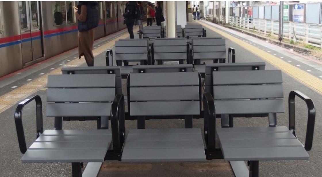 A diferencia de las estaciones de tren en Tokio, en algunas situadas en las prefecturas de Osaka y Hyogo los asientos para los pasajeros en los andenes están colocados lejos de la vía férrea y, lo más sorprendente, en paralelo al recorrido los trenes.