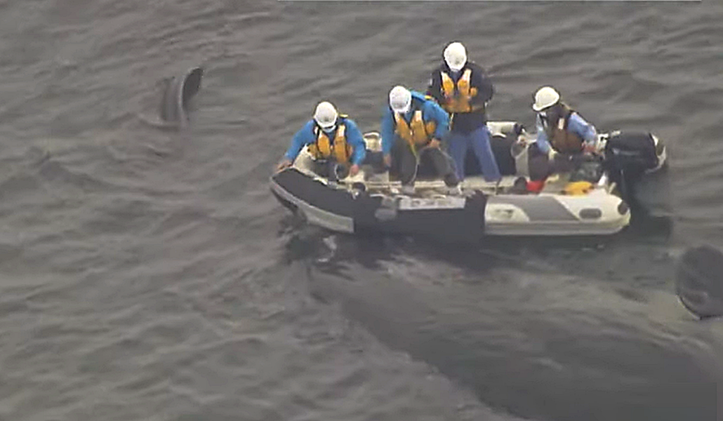 La embarcación fue llevada al sur entre las prefecturas de Wakayama y Tokushima y el cetáceo fue depositado en el agua poco después de las 3 de la tarde.