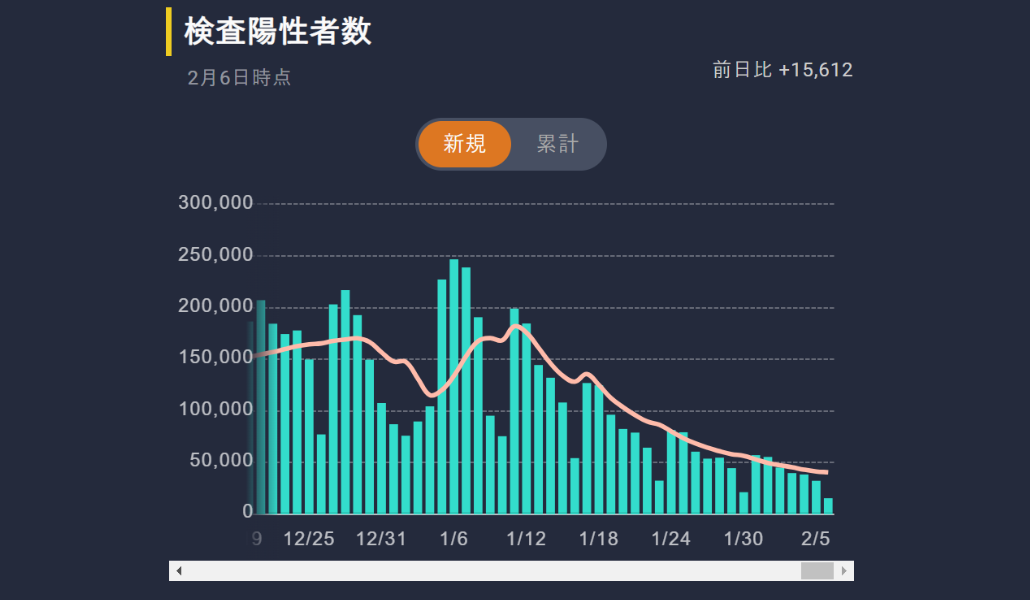 Japón registró hoy lunes 6 de febrero 15.612 nuevos casos de coronavirus y 124 muertos, según los datos del Ministerio de Salud, Trabajo y Bienestar Social.