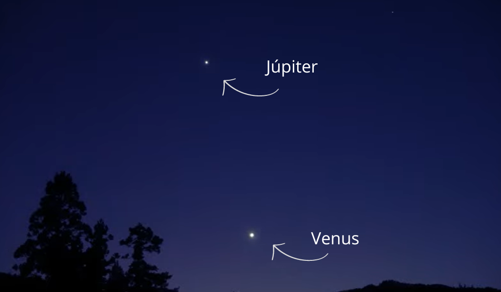 Ya es posible apreciar cómo los planetas Venus y Júpiter comienzan a acercarse. Este suceso astronómico es llamado también el «beso celestial».