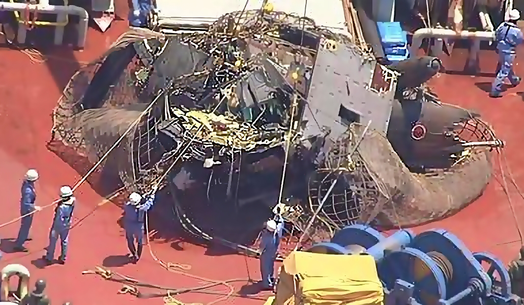 Alrededor de las 11:45 horas de hoy, el barco de salvamento Koyo Maru subió los cables que sostenían una gran red que apareció en la superficie del mar con lo que quedaba del helicóptero.