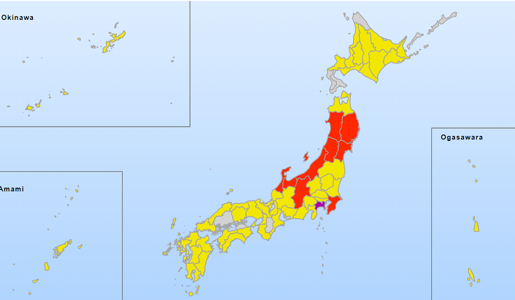 La Agencia Meteorológica de Japón mantiene su aviso de fuerte lluvias acompañadas de truenos para hoy lunes hasta el mediodía desde la región de Kanto hacia el norte del país.