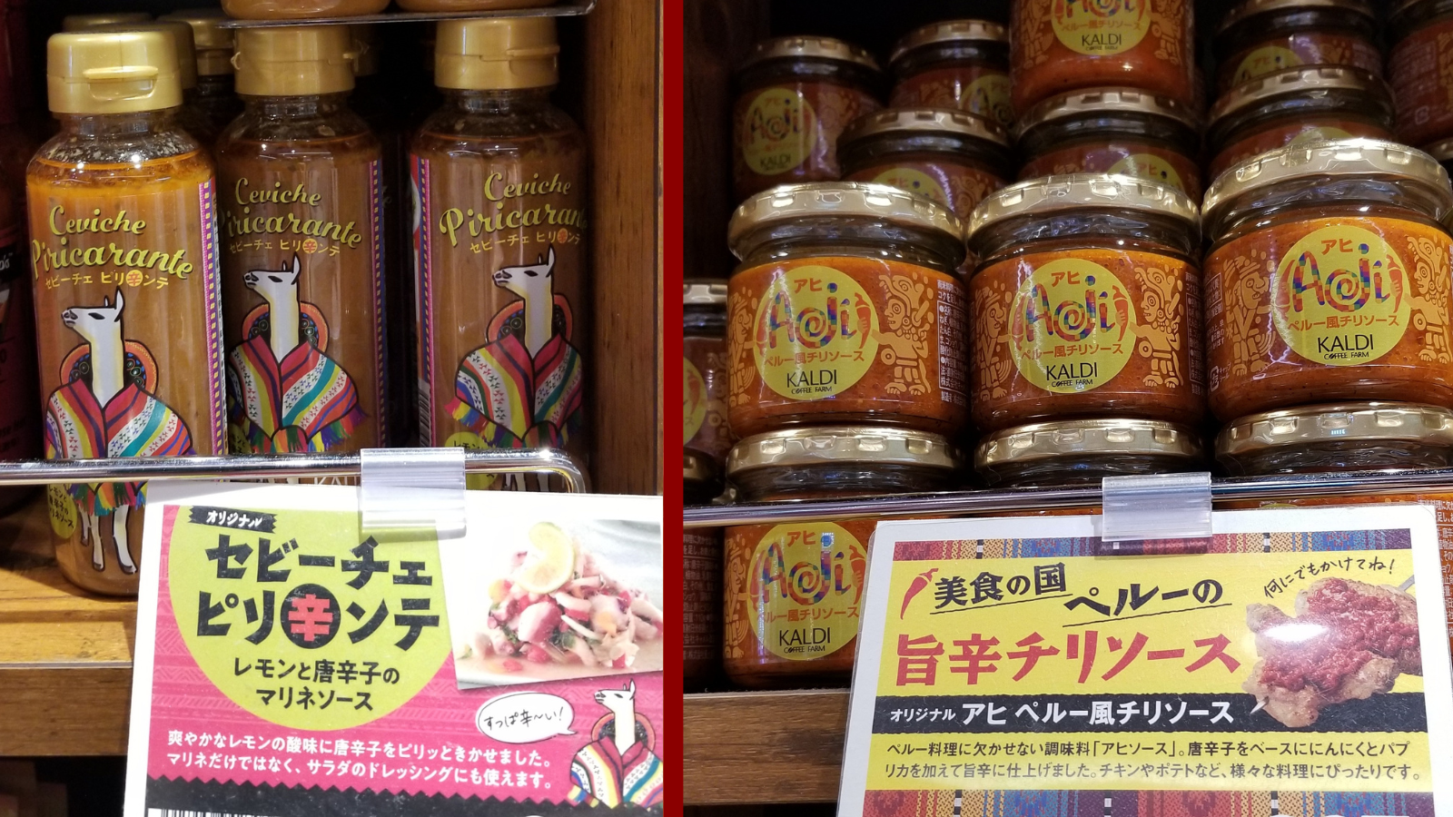 La popular cadena de productos importados Kaldi, lanzó al mercado japonés dos productos que buscan llevar los exóticos sabores del Perú a las mesas japonesas. Se trata de la salsa de ceviche peruano «Ceviche Piricarante» y la pasta de «Ají, Perú fuu Chili Sauce».