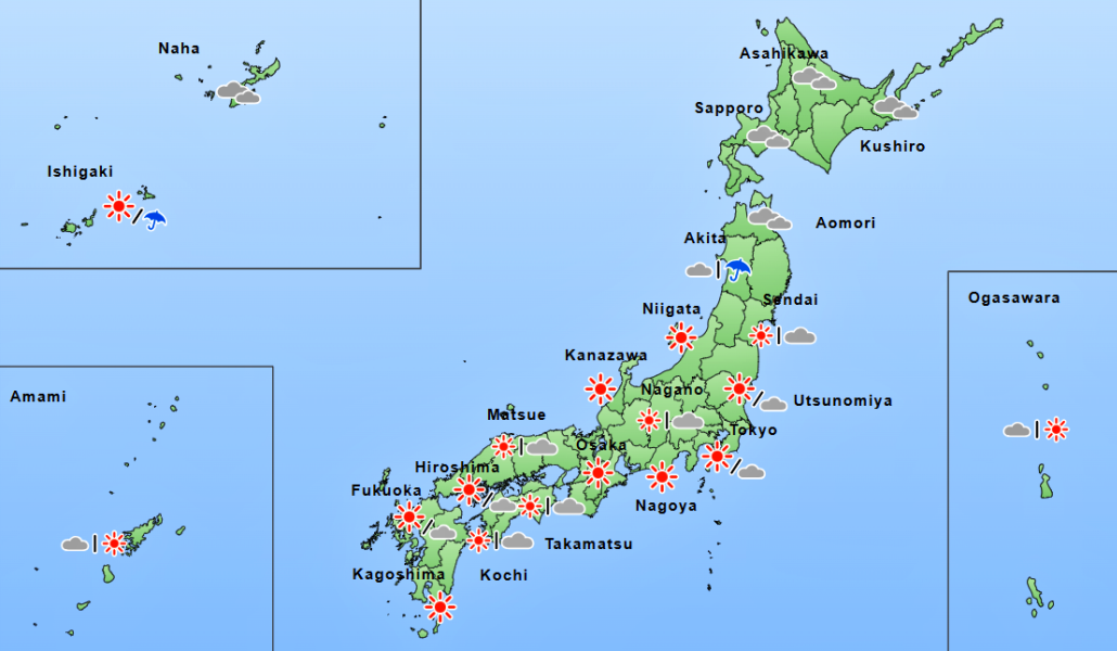 Según la Agencia Meteorológica las temperaturas más altas pueden alcanzar hoy los 38ºC en Nagoya y 37ºC en algunos puntos de Tokio.