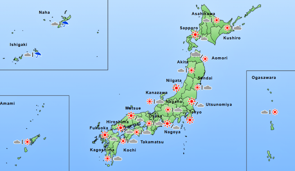 Hoy el sol brilla desde Hokkaido hasta Kyushu. Antes de las 10:00 horas Ushiku (Chiba) tenía 35ºC, Ebina (Kanagawa) 34,7ºC y 34,7ºC en Date (Yanagawa).