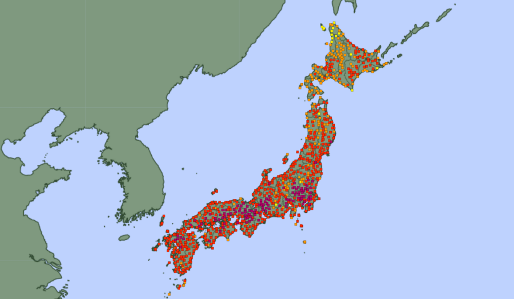 El Ministerio de Medio Ambiente emitió advertencias de golpe de calor en 35 de las 47 prefecturas de Japón, el mayor número de este año. Las temperaturas han estado subiendo desde horas de la madrugada en todo el país.