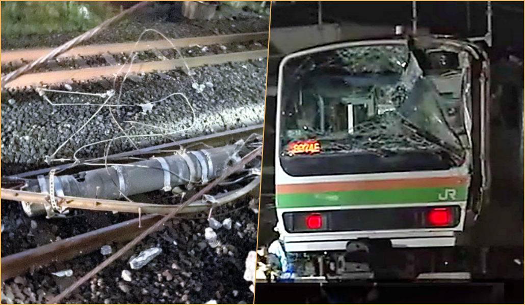 Miles de pasajeros resultaron afectados cuando a las 21:24 horas de ayer un poste de de electricidad de concreto se desprendió y golpeó la ventana frontal de un tren de la línea JR Tokaido en las inmediaciones de la estación Ofuna en la ciudad de Kamakura, prefectura de Kanagawa.