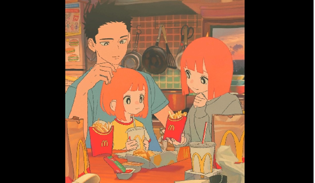 En el breve clip de anime, que promociona una oferta de patatas fritas y nuggets, tres personas, aparentemente una familia, comen los productos de McDonald’s sentadas alrededor de una mesa.