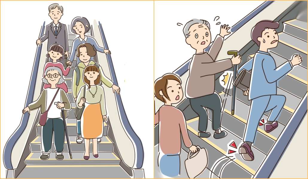 Según la Asociación de Ascensores de Japón, entre los años 2018-2019 hubo 805 casos de «comportamiento inadecuado» en escaleras eléctricas en todo el país, incluyendo caídas al caminar o correr por ellas.