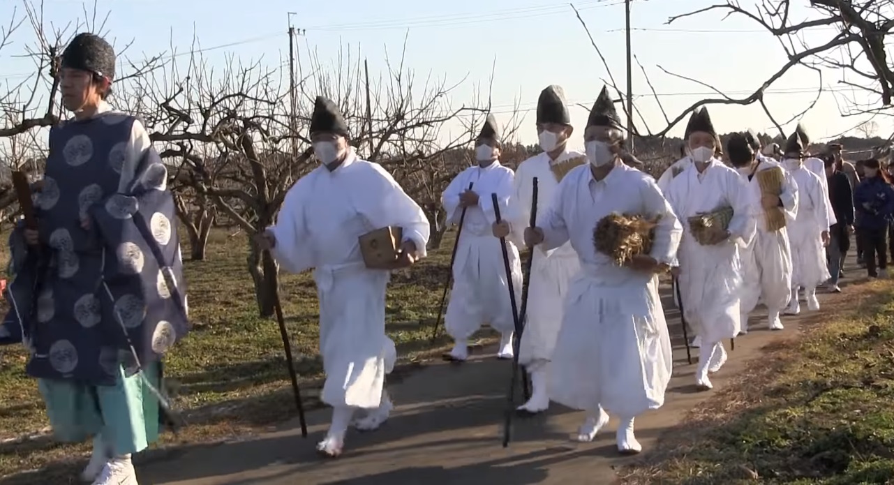 13 sacerdotes vestidos con túnicas blancas y sombreros negros que representan a los tengu -espíritus de nariz larga que viven en las montañas- inician un recorrido, explica el portal SoraNews24.