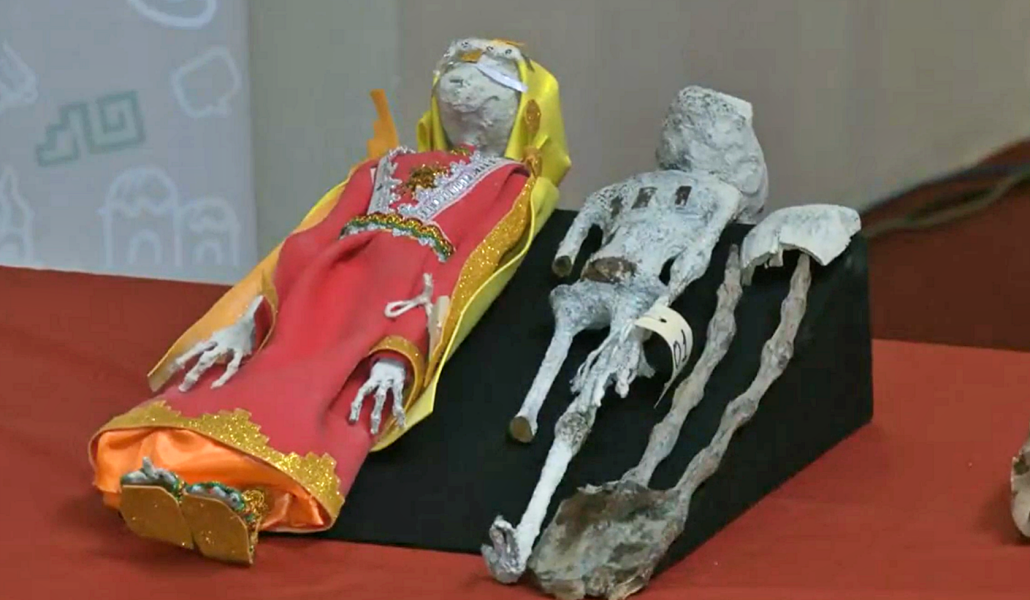Las dos figuras no identificadas, que parecían cuerpos momificados con cabezas alargadas y manos de tres dedos. Estaban vestidas con trajes coloridos y fueron interceptadas por el personal del Ministerio de Cultura antes de ser enviadas a México.