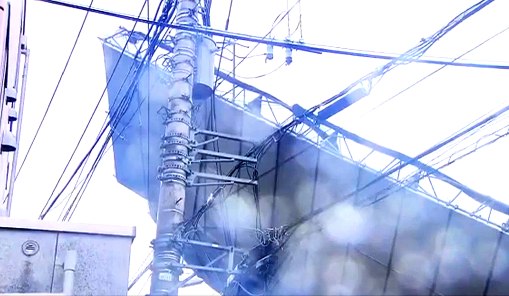 El andamio de metal instalado en un edificio de cuatro pisos, se derrumbó y quedó enganchado en cables eléctricos de la vía pública.