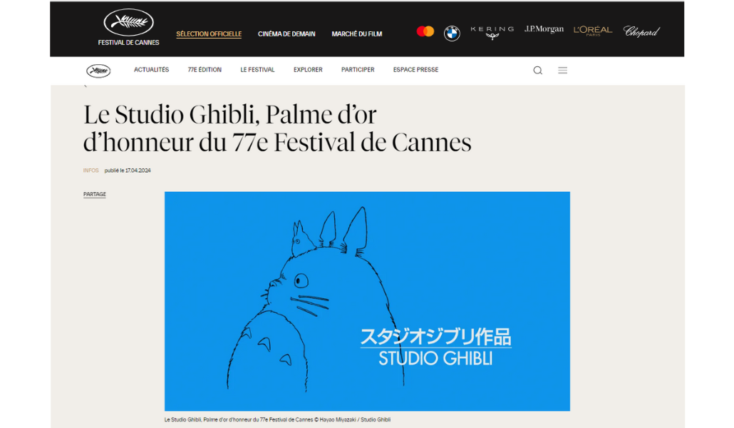 El anuncio fue realizado por los organizadores del Festival de Cannes, destacando los logros que Studio Ghibli ha alcanzado en el mundo del cine de animación.