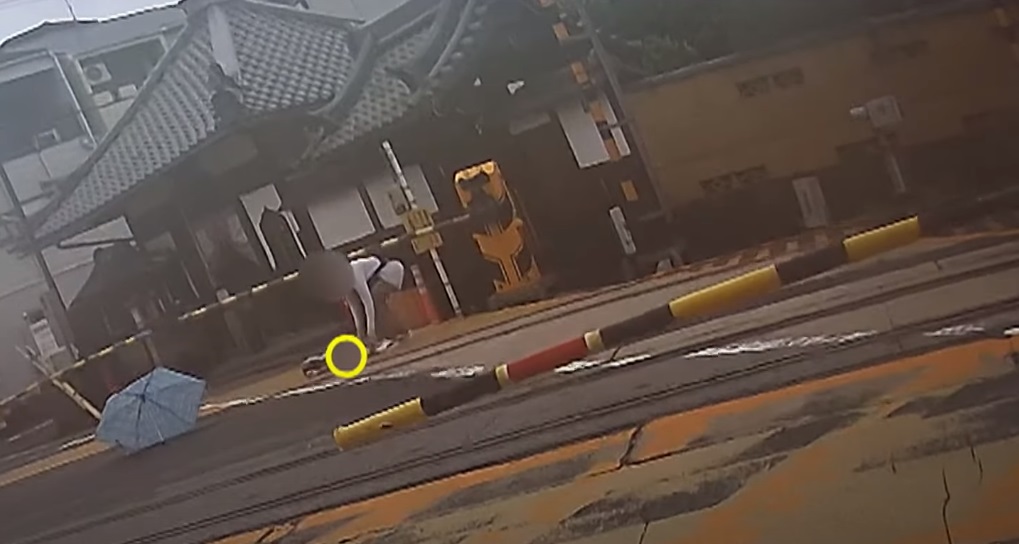 Mientras tanto, una mujer saltó la barrera y corrió hacia la anciana. El motociclista la imitó y luego se les unió personal de Japan Railways.