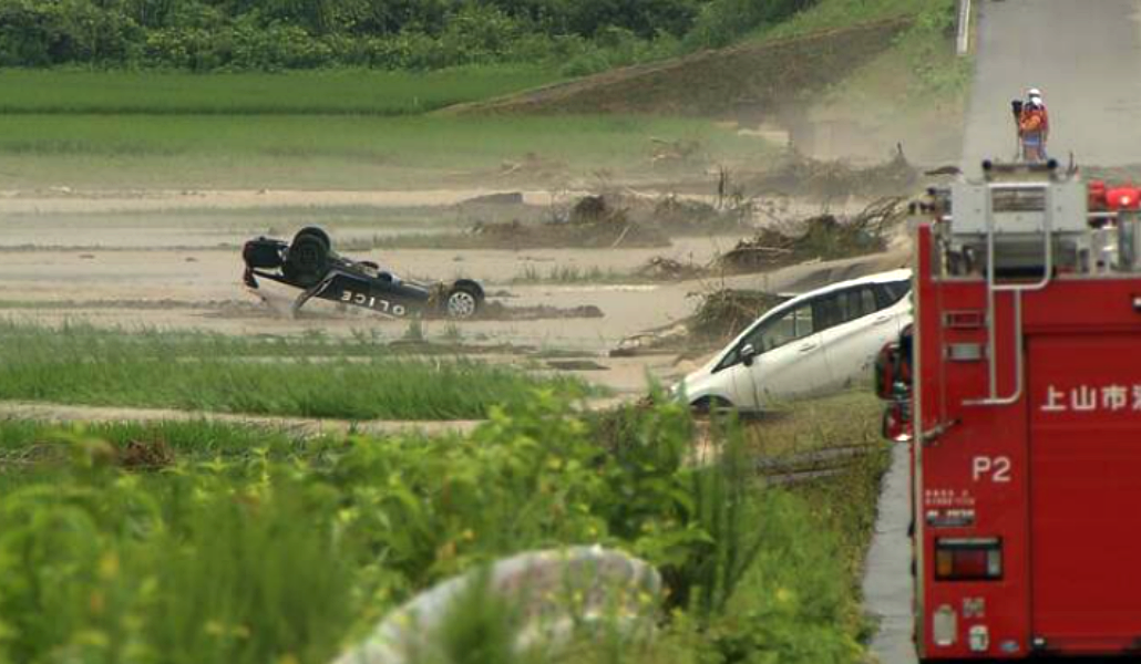 La policía informó que la patrulla de la estación policial de Shinjo, con un subinspector y un agente a bordo, fue arrastrada cerca del puente Fukudayama en Honagumi, mientras acudía a la zona por una llamada de emergencia a las 23:43 horas de ayer jueves. El subinspector logró comunicarse brevemente, reportando que estaban siendo arrastrados, antes de perder contacto.