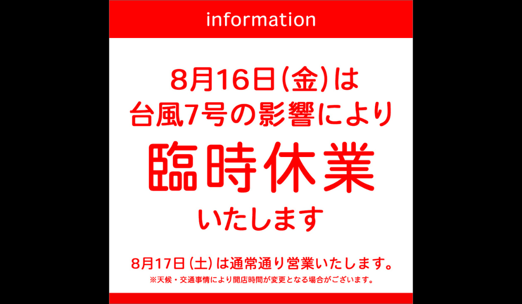 Ante la inminente llegada del tifón número 7, clasificado como extremadamente fuerte, varias tiendas y cadenas de restaurantes en Chiba cerrarán hoy, viernes 16, como medida preventiva.
