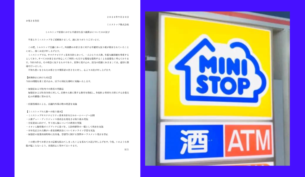 La cadena de tiendas de conveniencia Ministop emitió hoy un comunicado de disculpas por un cartel considerado discriminatorio en una de sus sucursales.
