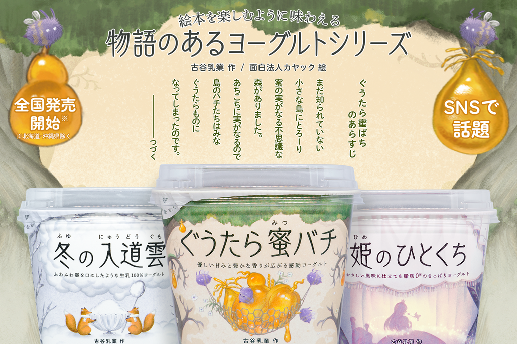 Furuya Milk y Kayac han presentado su nueva línea de yogures, que ya está causando sensación desde su pre-lanzamiento en redes sociales. Se trata de los «yogures con historia» (物語のあるヨーグルト Monogatari no aru Yogurt), diseñados para ser no solo deliciosos, sino también visualmente atractivos, con envases que incluyen cuentos infantiles.