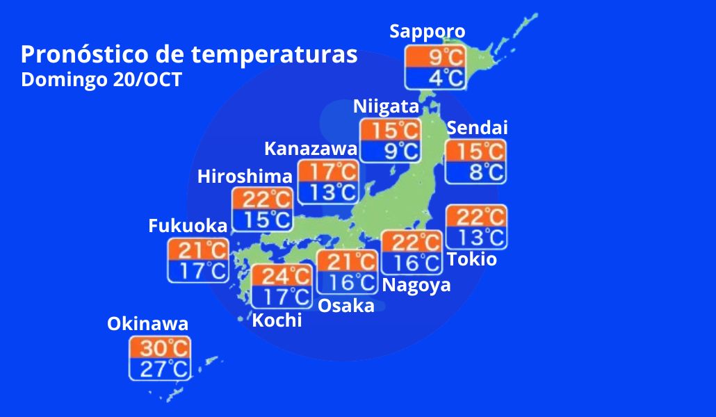 El descenso de las temperaturas ha sido drástico en todo el país. En Sapporo, la máxima no superará los 10°C, y en Asahikawa se prevén solo 9°C, lo que significa que el frío persistirá incluso durante el día en gran parte de Hokkaido. Tokio, que ayer alcanzó temperaturas veraniegas, experimentará un descenso de casi 10°C, con máximas cercanas a los 20°C, marcando así un claro inicio del otoño.