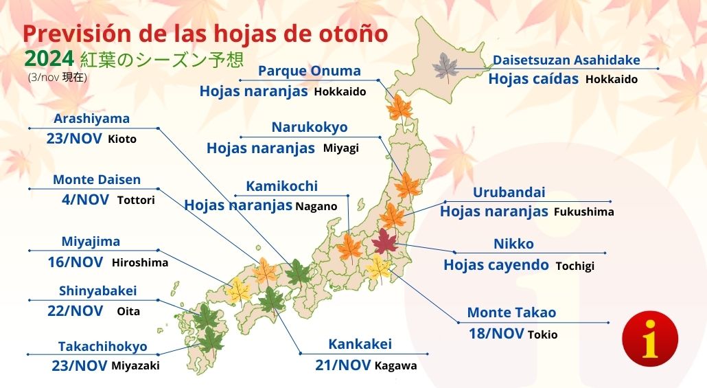 La Agencia Meteorológica de Japón presentó el jueves su tercer pronóstico sobre el momento en que las hojas de otoño alcanzarán su esplendor.