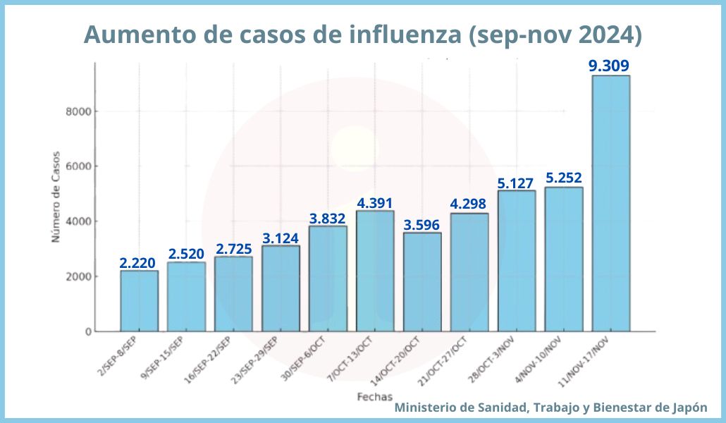 El Ministerio de Salud, Trabajo y Bienestar Social de Japón ha dado a conocer, el viernes 22 de noviembre, los últimos datos sobre la incidencia de la influenza en el país, revelando un aumento significativo en el número de casos confirmados. Durante la semana del 11 al 17 de noviembre, se registraron 9.309 casos, lo que representa un incremento de más de 4.000 personas respecto a la semana anterior, un aumento cercano al 80%. Con esta cifra, Japón ha entrado oficialmente en la temporada alta de brotes, y se espera que los contagios sigan en ascenso en las próximas semanas.