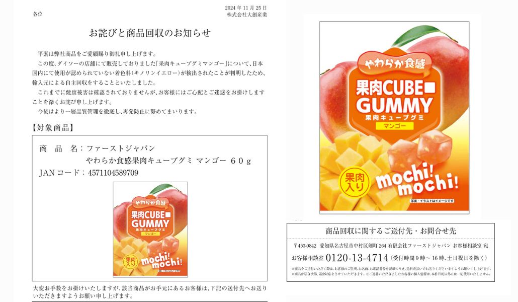 La cadena de tiendas Daiso ha retirado del mercado un producto de confitería tras detectarse que contiene un colorante no autorizado en Japón. Según un comunicado de la empresa matriz, Daiso Sangyo, el producto afectado es el «First Japan Yawaraka Shokkan Kanjuku Cube Gummy Mango» (ファーストジャパン やわらか食感果肉キューブグミ マンゴー), fabricado en Vietnam y distribuido entre el 16 de agosto y el 22 de noviembre de 2024.