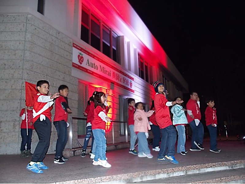El lunes pasado, bajo un intenso frío y ante el edificio comunitario iluminado, también se presentaron niños peruanos del «Taller de español Amauta» para bailar danzas típicas vistiendo camisetas rojas con la palabra «Perú» y también de la Selección Peruana.