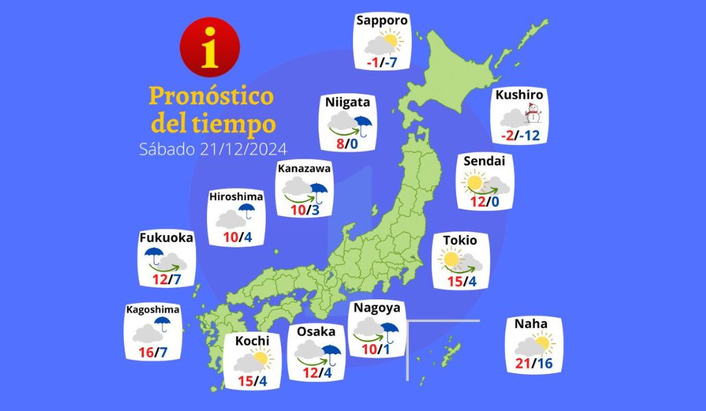 El sábado 21 de diciembre, un sistema de baja presión afectará varias regiones de Japón. Durante el día, Kanto y Tokai tendrán cielos mayormente despejados, pero por la tarde, la nubosidad aumentará y se esperan lluvias en las zonas costeras.