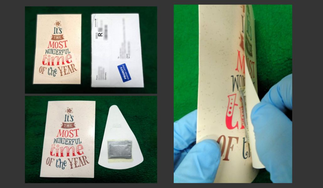 El caso fue detectado durante un control de rayos X realizado por funcionarios de aduanas, quienes identificaron una sombra sospechosa en el paquete. Un perro detector de drogas confirmó la presencia de narcóticos. La sustancia estaba oculta bajo un fragmento de papel con un diseño idéntico al de la tarjeta navideña impresa, lo que sugiere un intento de evadir la inspección.
