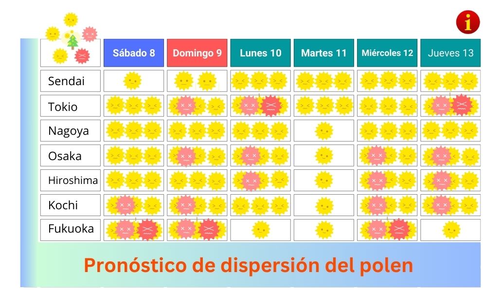 Hoy, Japón ha experimentado una fuerte dispersión de polen, especialmente en las regiones de Kanto y Kyushu, donde los vientos del norte han incrementado la cantidad de polen de cedro (sugi kafun) en el aire. Esta tendencia continuará durante los próximos días, con pronósticos de niveles elevados en todo el país.