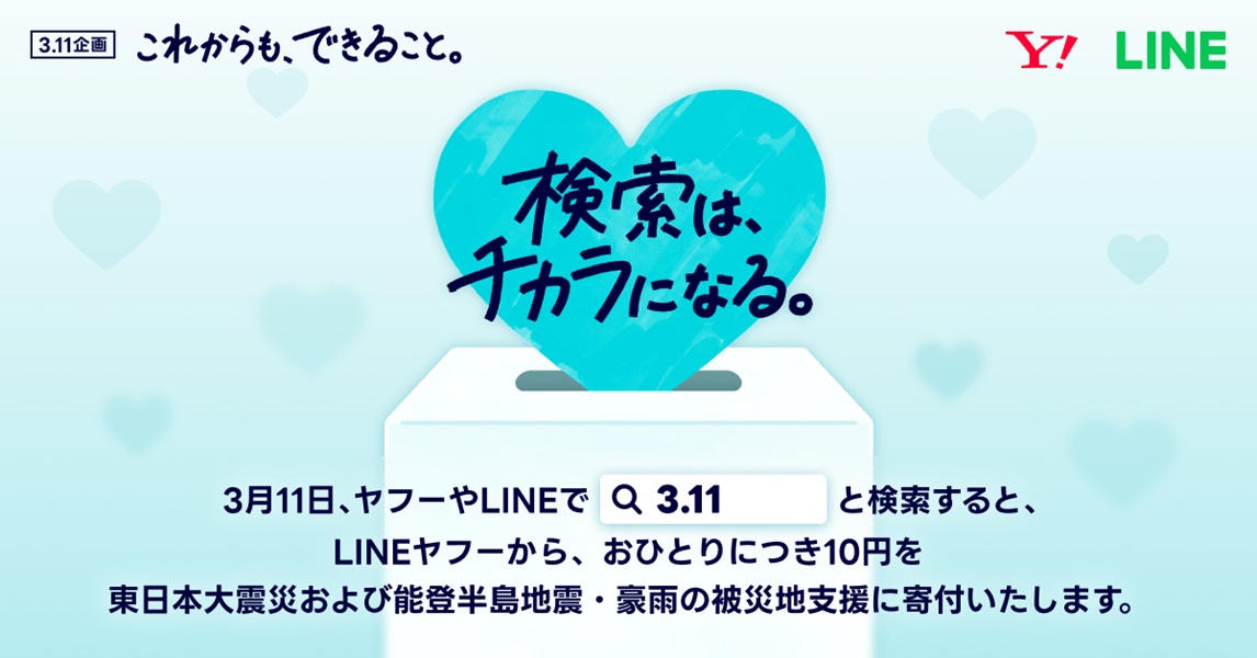 Cada 11 de marzo, en el aniversario del terremoto y tsunami de 2011, LINE Yahoo! lleva a cabo su campaña solidaria, destinando 10 yenes por cada búsqueda realizada por los usuarios en las plataformas Yahoo! y LINE. La campaña se llevará a cabo durante todo el día 11 de marzo, desde las 00:00 hasta las 23:59, y los fondos recaudados se destinarán a apoyar a las víctimas del Gran Terremoto de Japón del Este y los recientes desastres ocurridos en la península de Noto, incluidos el terremoto y las lluvias torrenciales.