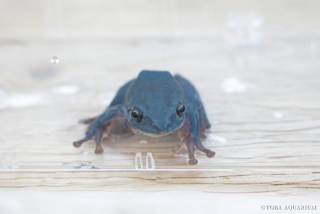 Una Rhacophorus schlegelii de color azul, una rara variante de la rana arbórea de Schlegel, está siendo exhibida en el Acuario de Toba, en la prefectura de Mie. El ejemplar, de unos 4 centímetros de largo, fue encontrado el pasado 8 de abril por un residente local en un camino de campo en la zona de Daiki.