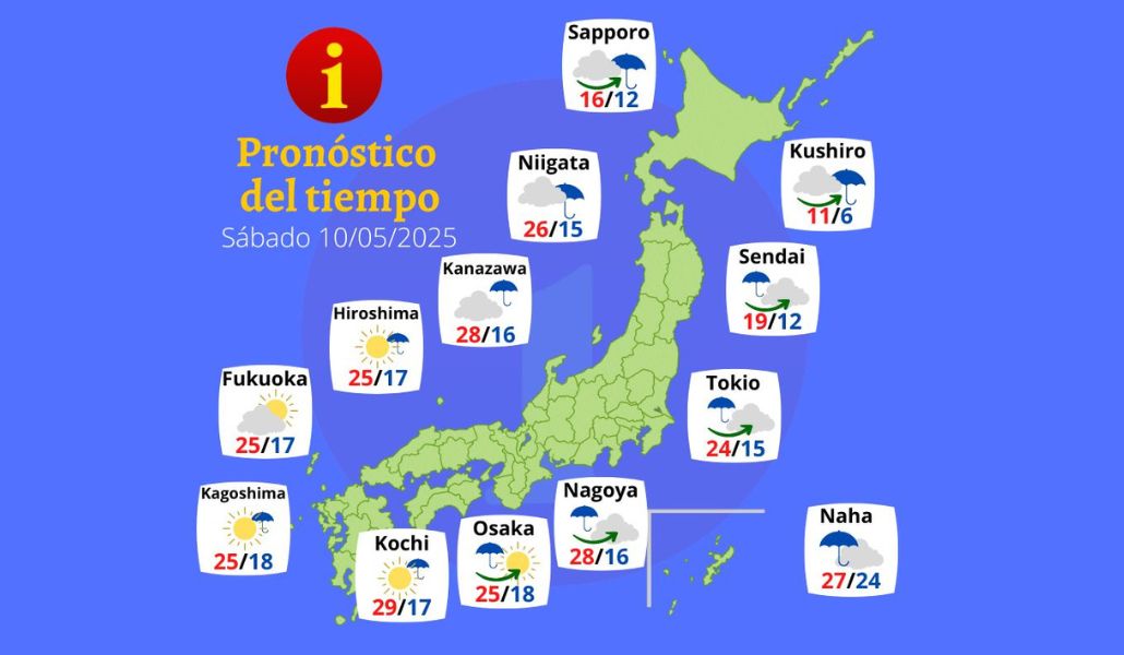 Para este sábado 10 de mayo, se prevén lluvias en el este y norte de Japón, así como en Okinawa. En Kanto y la región de Tokai, las precipitaciones serán intensas desde la mañana, con posibilidad de tormentas eléctricas, especialmente en los alrededores de Shizuoka.