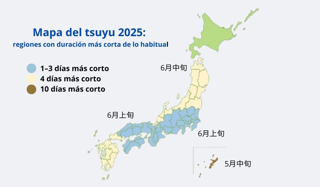 El inicio de las lluvias será más tardío en Okinawa y Amami, dos de las primeras zonas en recibir la influencia del frente estacional. En contraste, desde el sur de Kyushu hasta el norte de Tohoku, la llegada del «tsuyu» se dará en torno a las fechas habituales. El final de la temporada se adelantará en Okinawa, Kansai y Tohoku, mientras que en las regiones de Tokai, Kanto-Koshin y Hokuriku finalizará dentro del promedio. Según el análisis, Okinawa y Amami podrían registrar una temporada de lluvias hasta diez días más corta que en años anteriores.